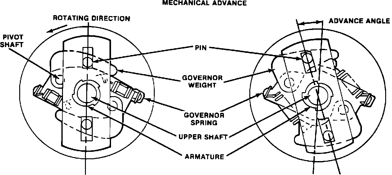 The mechanical advance mechanism consists of two weights pivoted so that they move outward from the distributor shaft as the engine speed increases. As the weights move outward, they turn the breaker plate in relation to the lower distributor shaft, thus advancing the ignition timing. Each weight is restrained by two springs of different tension, giving a progressive advance action. The amount the weights move outward is in direct proportion to the distributor shaft speed.