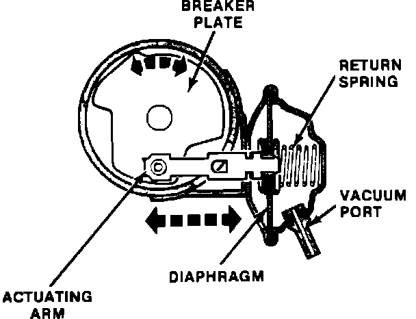 In the vacuum control mechanism, one side of the diaphragm is linked to the movable breaker plate and the other side is connected by a vacuum line to a port just above the throttle plate. A spring is fitted between the vacuum unit connection. The vacuum applied at the diaphragm, combined with the action of the diaphragm spring, gives correct spark advance by moving the breaker plate in relation to the distributor shaft. Spark advance will vary according to the load placed on the engine. As the vacuum advance does not operate at idling speed due to the throttle plate being almost closed, the main action will occur as throttle opening, load and manifold vacuum varies during operation.
