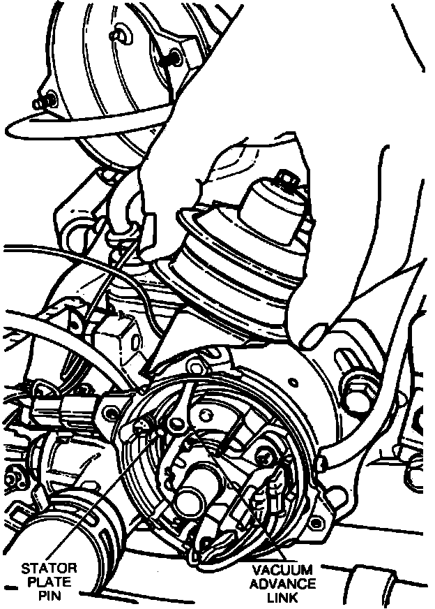 1. Position the vacuum advance housing on the distributor housing, installing the link with the pin on the stator plate.