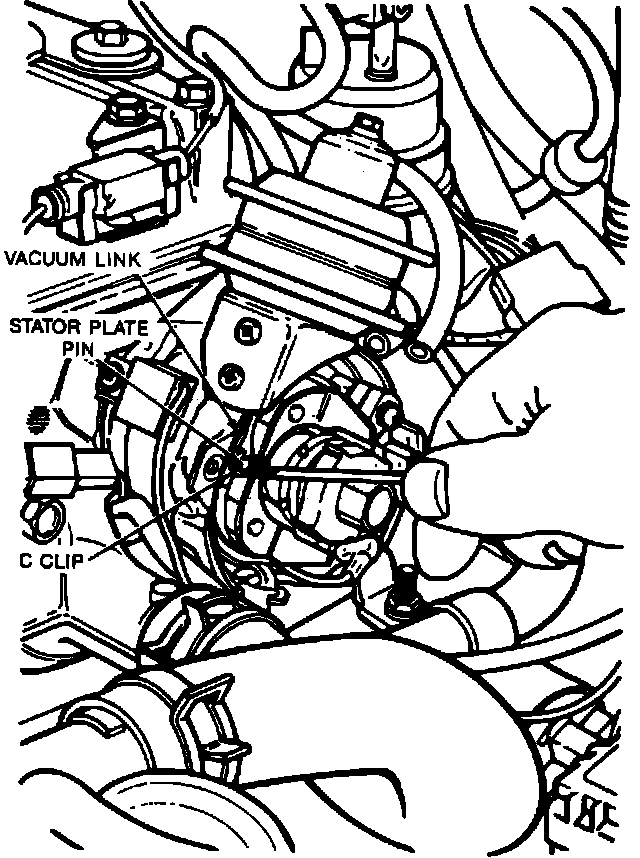 3. Remove the C-clip while securing the vacuum advance link to the stator plate.