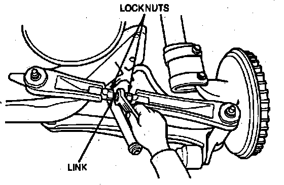 Rear toe should always be checked whenever an alignment on the front wheels is required. Rear toe should be adjusted prior to setting the front alignment angles. Rear toe is adjusted by loosening the locknuts and rotating the adjustment link on the rear control arms, Fig. 2. One turn of the link will change toe .044 inch.