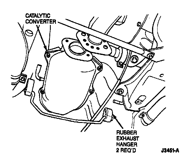 8. Remove retaining nuts and separate catalytic converter from front exhaust pipe. Disconnect two rubber exhaust hangers and lower exhaust assembly. Wire exhaust assembly into position as shown.