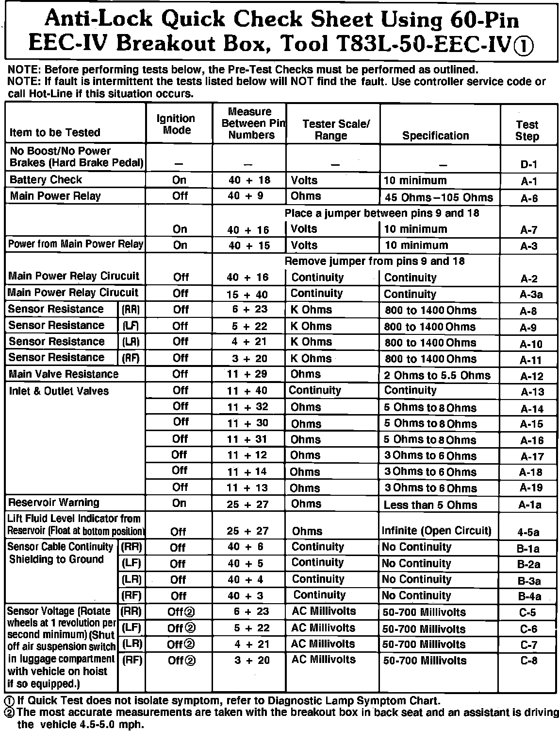Refer to ABS quick check sheet Fig. 18, for item to be tested, ignition switch mode position, measurement taken between terminal pin numbers, tester scale/range, volt/ohm specifications and the specific pinpoint test to correct this group of malfunctions. Refer to DIAGNOSTIC CHARTS for Pinpoint Tests.