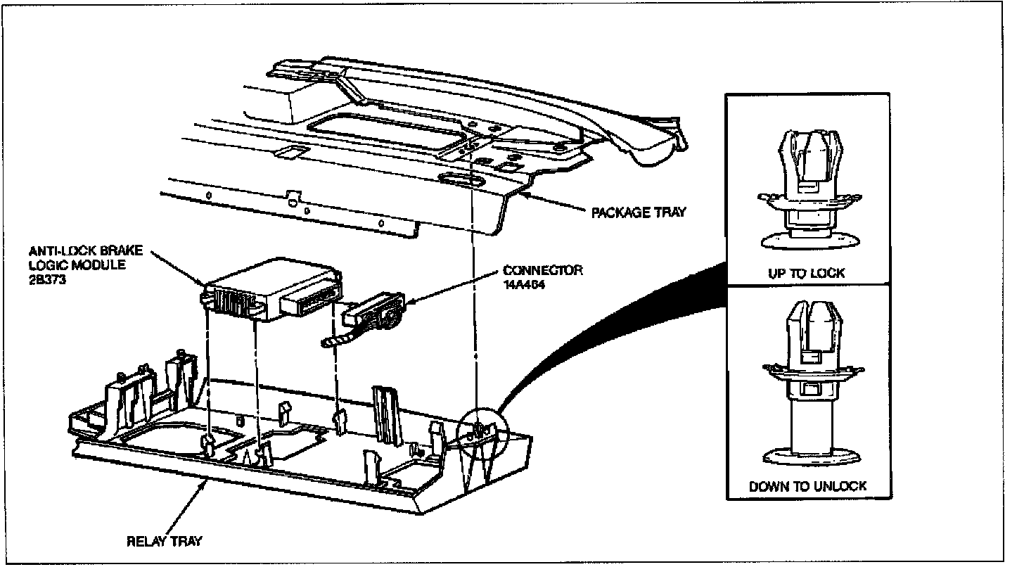1. Lower relay tray in luggage compartment to expose electronic control module by pulling down on pin.