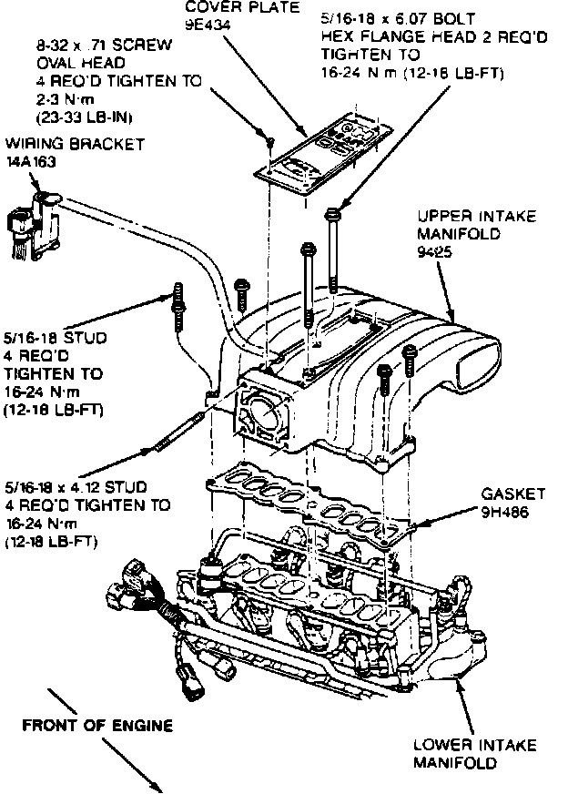 4. Install six upper intake manifold retaining bolts. Tighten to 12-18 lb. ft. (16-24 N-m).