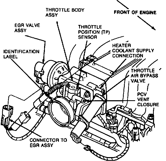 The Throttle Position (TP) sensor, mounted on the throttle body, is a potentiometer that monitors throttle plate angle and sends a signal to the Electronic Control Assembly (ECA). The TP sensor contains a pivot arm that moves along a curved resistor. One of the sensor leads supplies a five (5) volt reference signal (sent by the ECA) to the resistor. The second lead is used to ground the resistor. The third lead is for the voltage signal to the ECA.