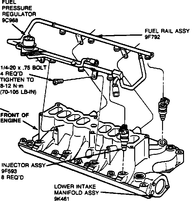 2. Install retaining bolts while holding fuel rail down. Tighten to 70-105 lb. in. (8-12 N-m).