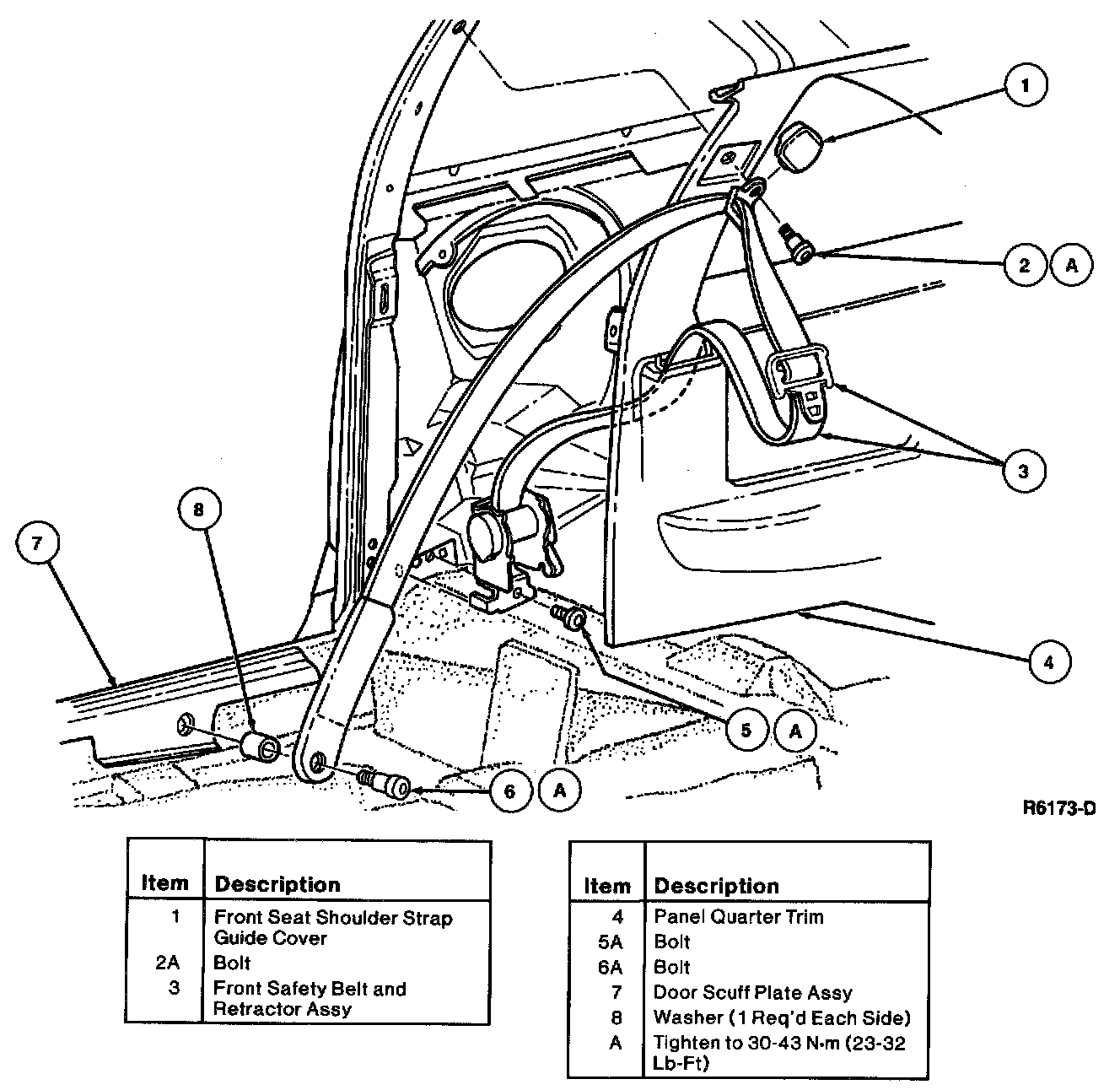 2. Tighten retaining bolts to 30-43 Nm (23-32 lb-ft). Cycle the system several times to ensure proper operation of the retractor. Ensure safety belt is not twisted.