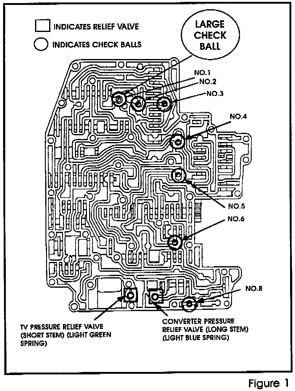 The 1989 and later AODs have been known to damage the large (5/16") orange checkball in the valve body (figure one). In many cases, this damage results in the checkball blowing through the separator plate. The checkball will either lodge in a passage or be digested by the transmission altogether. This results in a very harsh 4-3 kickdown.