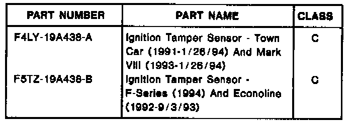 1994 TOWN CARS BUILT AFTER 1/26/94 AND F-SERIES BUILT AFTER 9/7/94 DO NOT HAVE THE IGNITION KEYLOCK CYLINDER SENSOR. THEY USE A MODIFIED ANTI-THEFT MODULE WHICH IGNORES THE SENSOR. 1994 MARK VIII BUILT FROM 1/27/94 THROUGH 11/6/94 AND 1994 ECONOLINE BUILT FROM 9/8/94 THROUGH 11/13/94 DO NOT HAVE THE IGNITION KEYLOCK CYLINDER SENSOR. THEY USE A MODIFIED ANTI-THEFT MODULE WHICH IGNORES THE SENSOR.