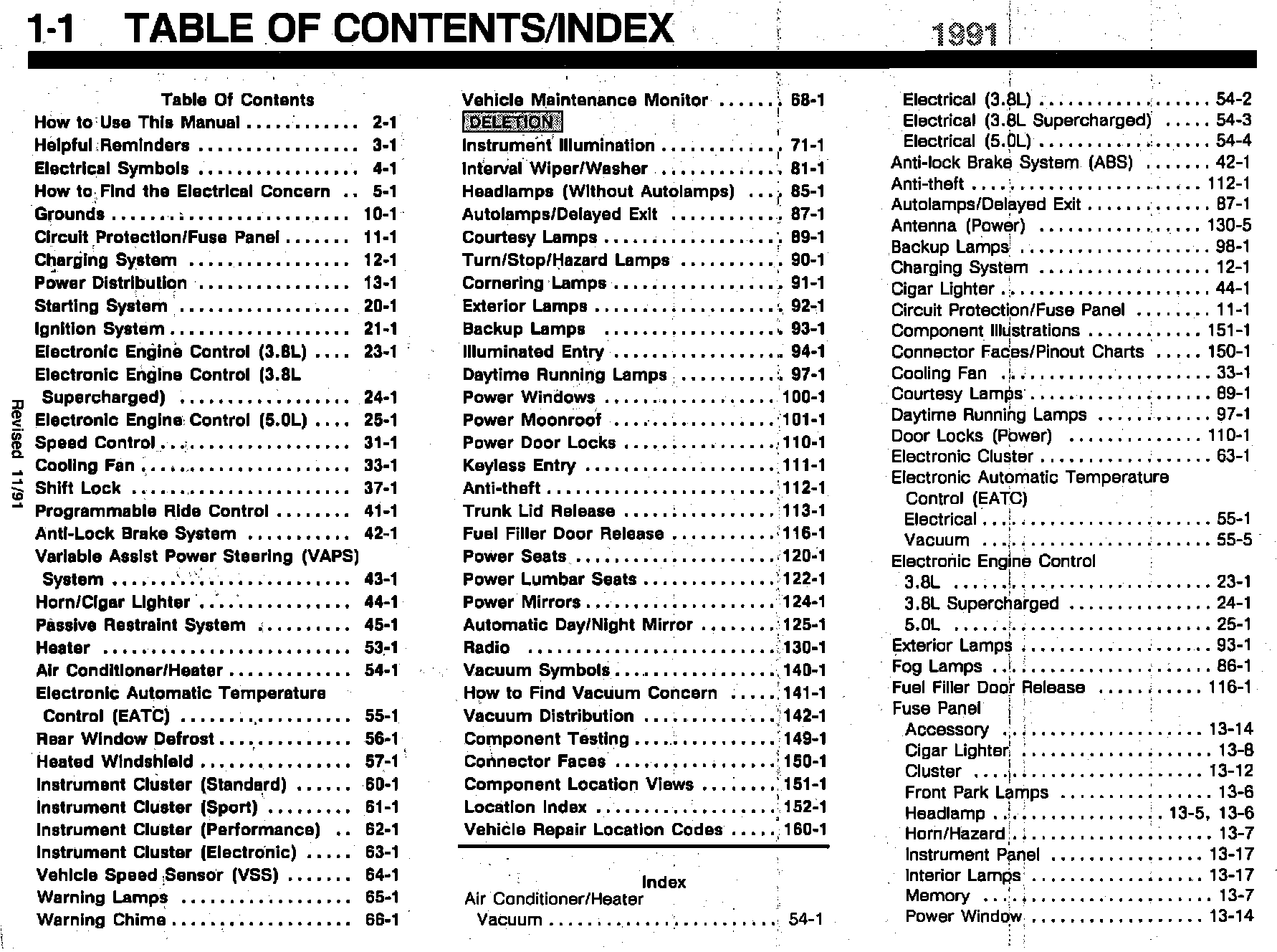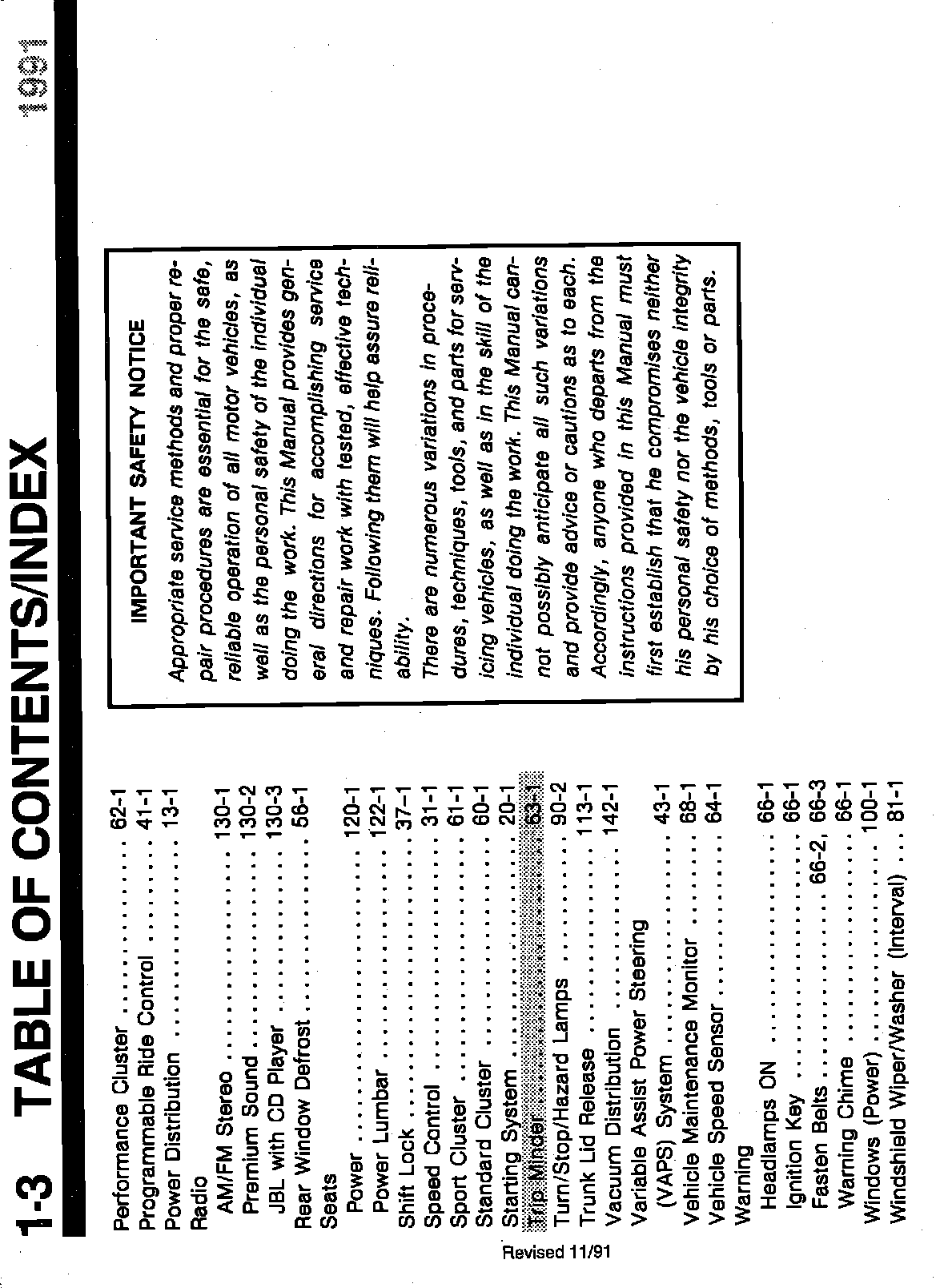 ISSUE: Page location for Tripminder information was incorrectly referenced in the Table of Contents. Pages 1-1 and 1-3 of the 1991 Thunderbird/Cougar EVTM are affected.