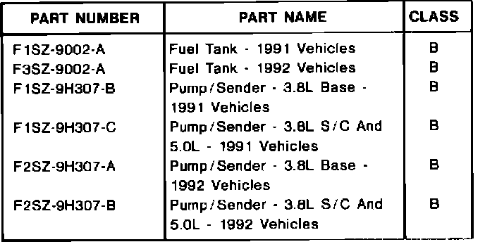 Install a new fuel tank made of a revised material along with a new pump/sender unit. Refer to the Parts Block for correct parts usage. Refer to the 1991 Thunderbird/Cougar Service Manual, Section 10-01, for service details.