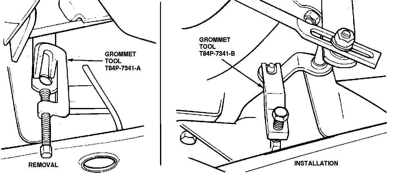 1. Place lower jaw of shift linkage insulator tool No. T67P-7341-A, or equivalent, between lever and rod, Fig. 13. For limited work space applications, use grommet tool No. T84P-7341-A or equivalent, Fig. 14.