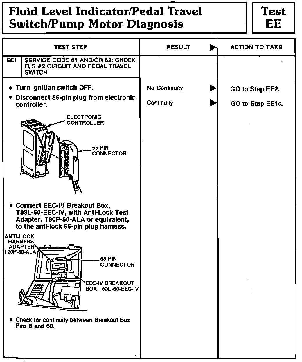 Fig. 55 Test EE1 (Fluid Level Indicator, Pedal Travel Switch & Pump Motor). 1991 Continental/Sable & Taurus: