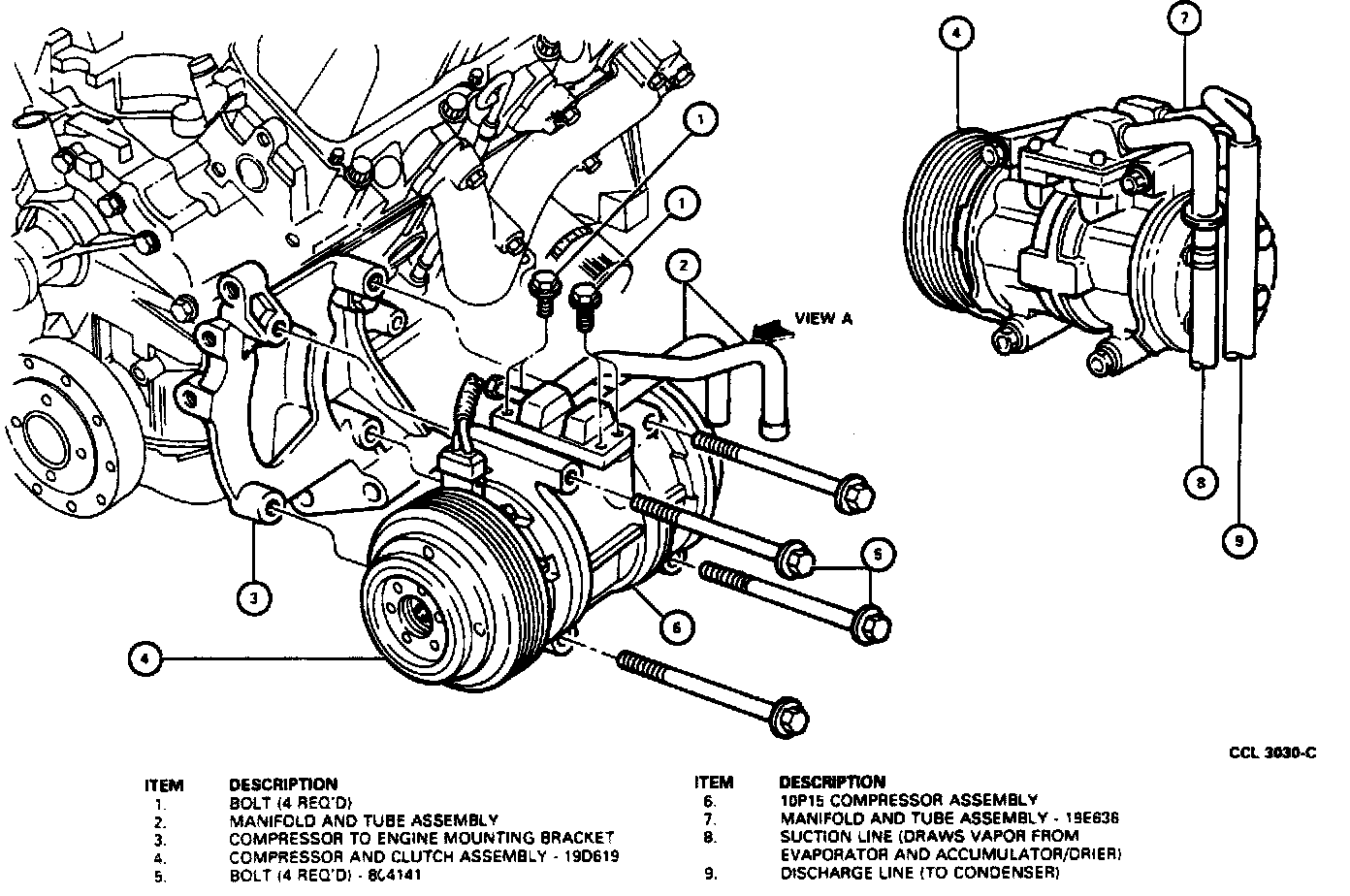 6. Remove compressor and manifold and tube assembly from vehicle as a unit. Assembly will not clear sub-frame and radio support if attempt is made to remove unit from bottom. It must be removed from top.