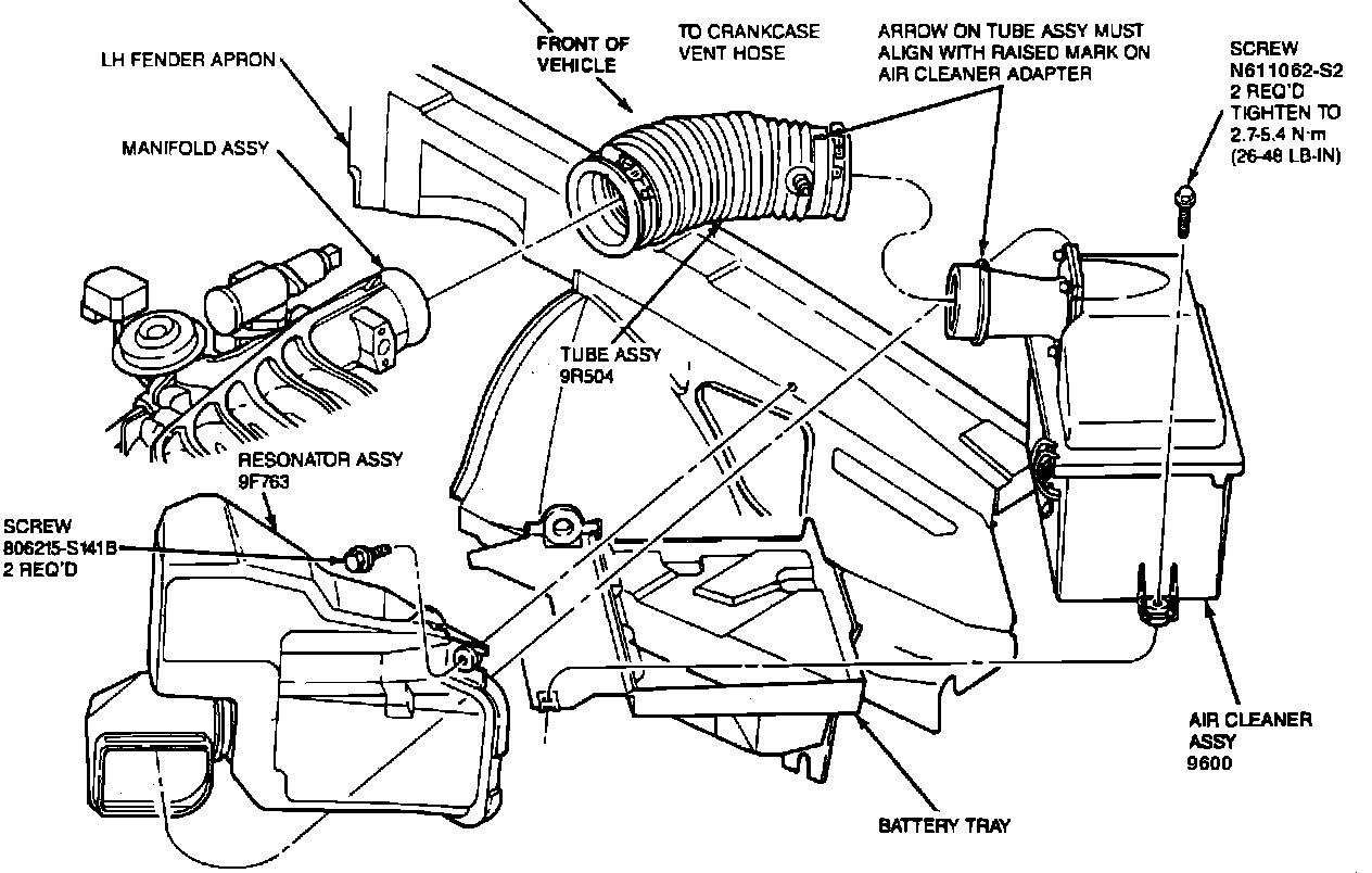 1. Position air cleaner assembly to battery tray. Ensure that mounting grommet is installed with metal side up and locating boss is fully seated in the battery tray grommet. Ensure the resonator tabs are fully locked into air cleaner opening.