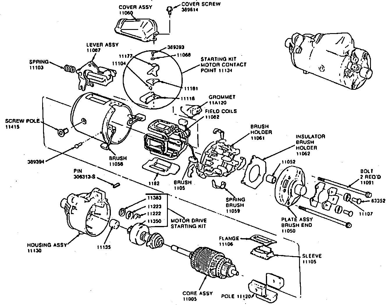 When the ignition switch is turned on to the start position, the starter relay is energized and supplies current to the motor. The current flows through one field coil and a set of contact points to ground. The magnetic field given off by the field coil pulls the moveable pole, which is part of the lever, downward to its seat. When the pole is pulled down, the lever moves the drive assembly into the engine flywheel, Fig. 2.