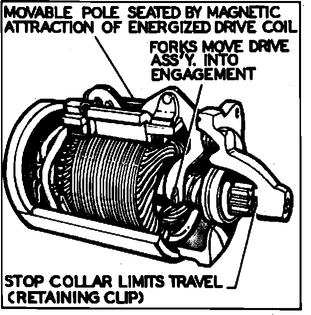 When the moveable pole is seated, it functions as a normal field pole and opens the contact points. With the points open, current flows through the starter field coils, energizing the starter. At the same time, current also flows through a holding coil to hold the movable pole in its seated position.