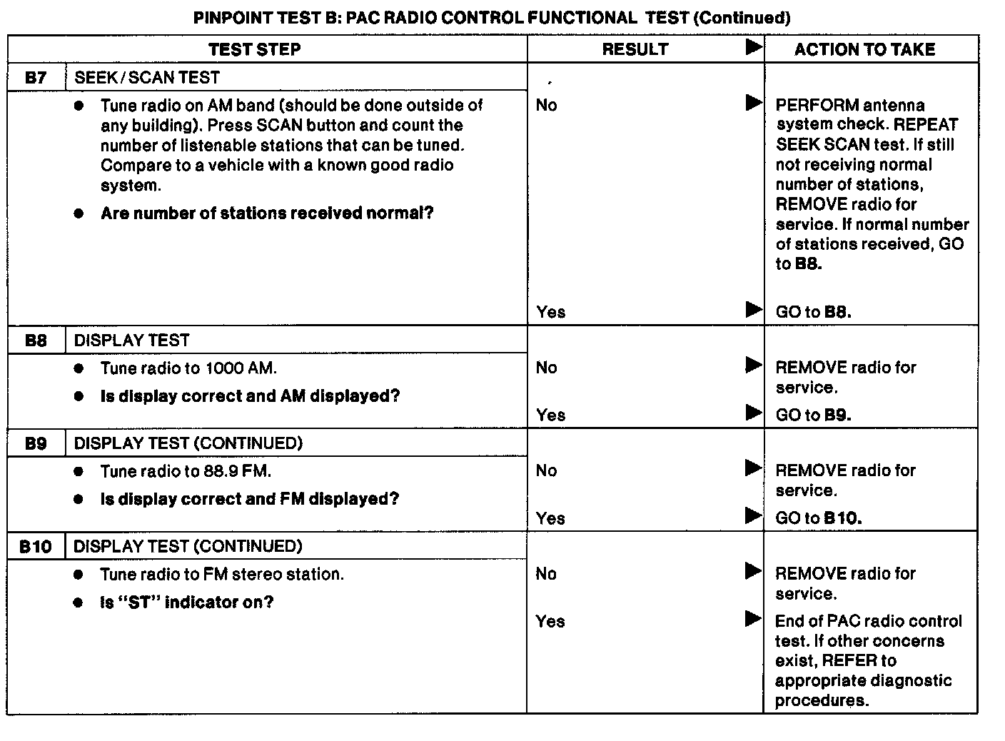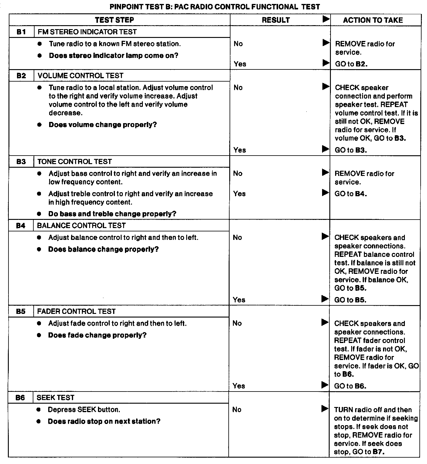 NOTE: When performing the following PAC radio test, keep in mind that bass, treble, balance and fade are adjusted using the AUDIO and VOLUME buttons. Volume level is normally displayed by the function bar below the station frequency. Each successive push on the AUDIO button sequentially selects bass, treble, balance fade and returns to normal (frequency and volume) mode. The selected item is indicated in the display by the word BASS, TREB, BAL or FADE.After selecting the appropriate mode, push the VOLUME button to adjust to the left (-) or right (+). In fade mode, the left side represents the front speakers and the right side represents the rear speakers. The - normal volume and frequency mode will return five seconds after the last bass, treble, balance or fade adjustment.