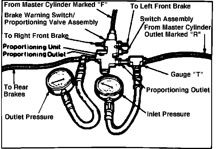 To test the valve, install gauge set shown in Fig. 4 in brake line between master cylinder and proportioning valve, and at output end of proportioning valve and brake line as shown. Be sure all joints are fluid tight.
