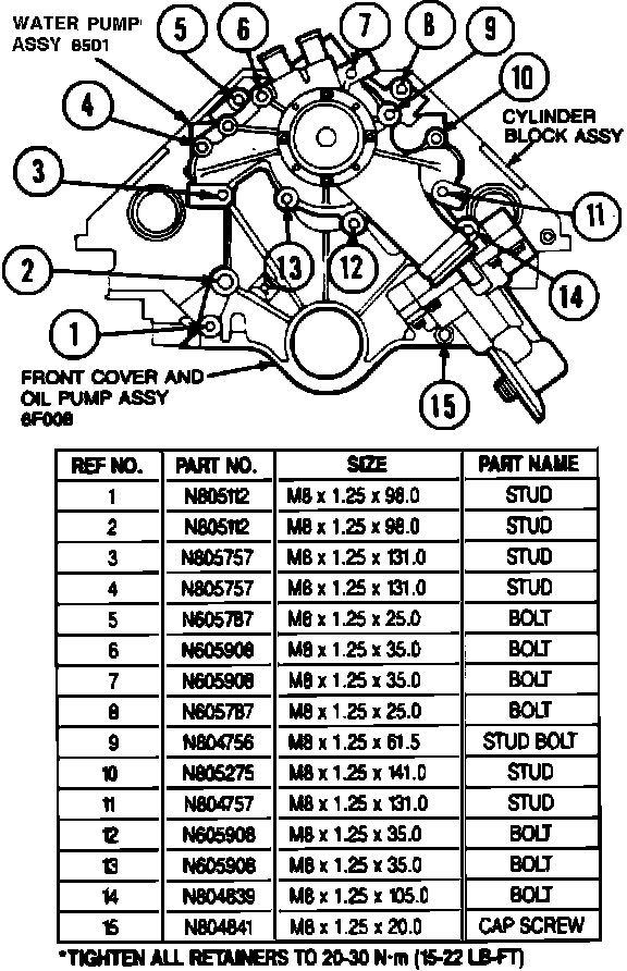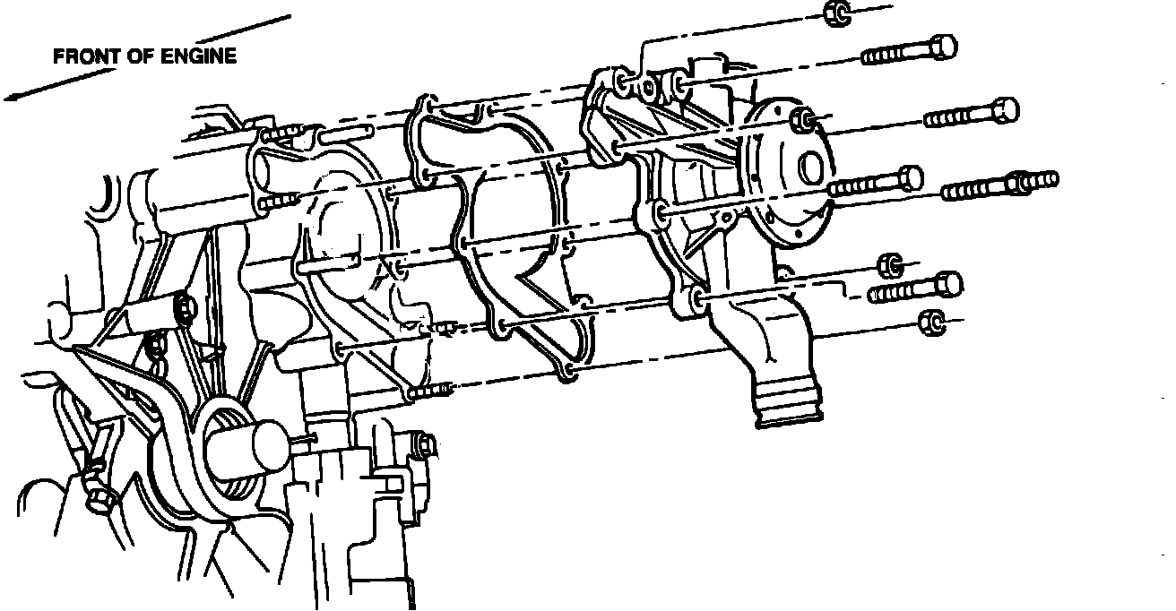 8. Remove the 9 water pump to engine retaining bolts and nuts then remove the water pump from the vehicle.