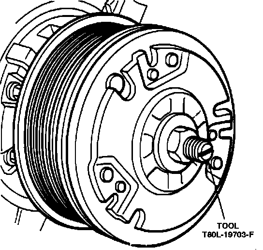 4. Install clutch hub on compressor shaft using new shims between clutch hub and end of shaft. Ensure shaft key is aligned with keyway in clutch hub. Do not attempt to drive hub on compressor shaft as damage to compressor will result. Use tool T80L-19703-F or equivalent if hub will not easily slide on compressor shaft, Fig. 5.