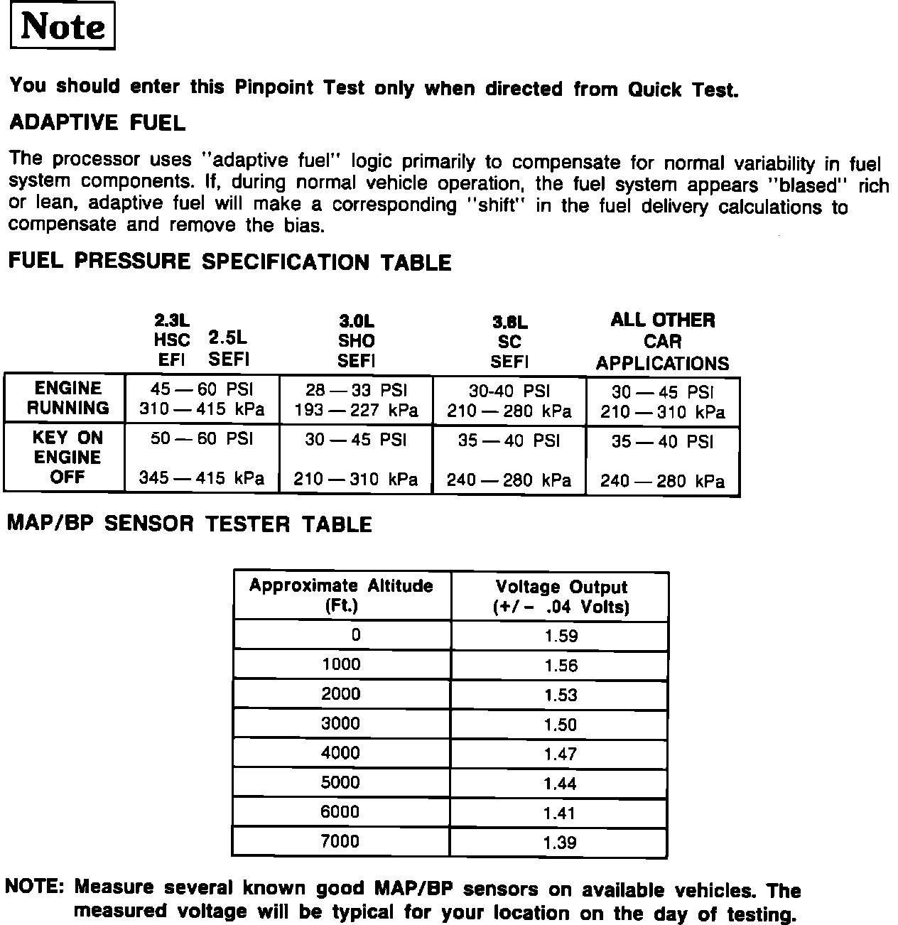 Pinpoint Test HA, Testing Notes And Fuel Pressure Specification Table: