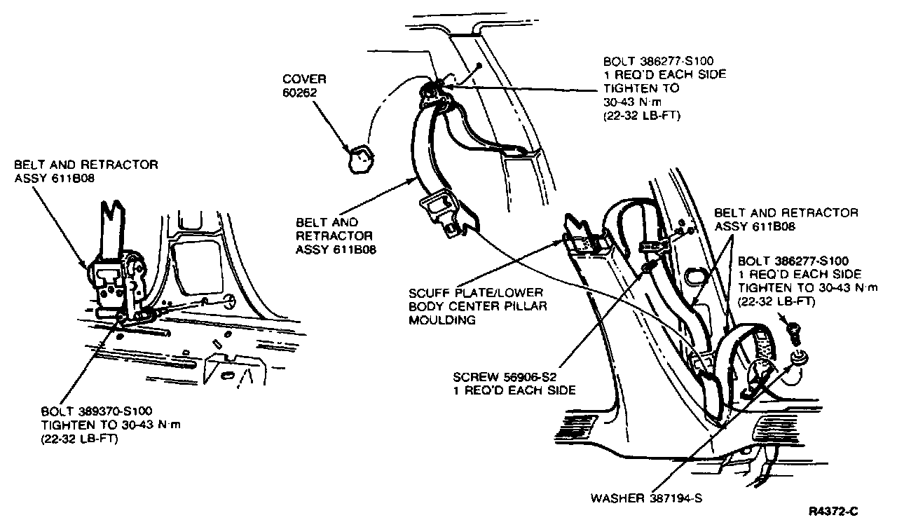 NOTE: Seat Belt Bolt Bit T77L-2100-A or equivalent should be used for safety belt bolt removal and installation on front outboard belts. A metric socket is necessary to remove or install inboard buckles and center passenger belt anchors.
