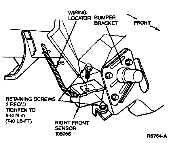 1. Position RH front sensor and wire lead in vehicle and secure sensor to RH lower outer radiator support with two retaining screws. Tighten screws to 9-14 N.m (7-10 lb-ft).