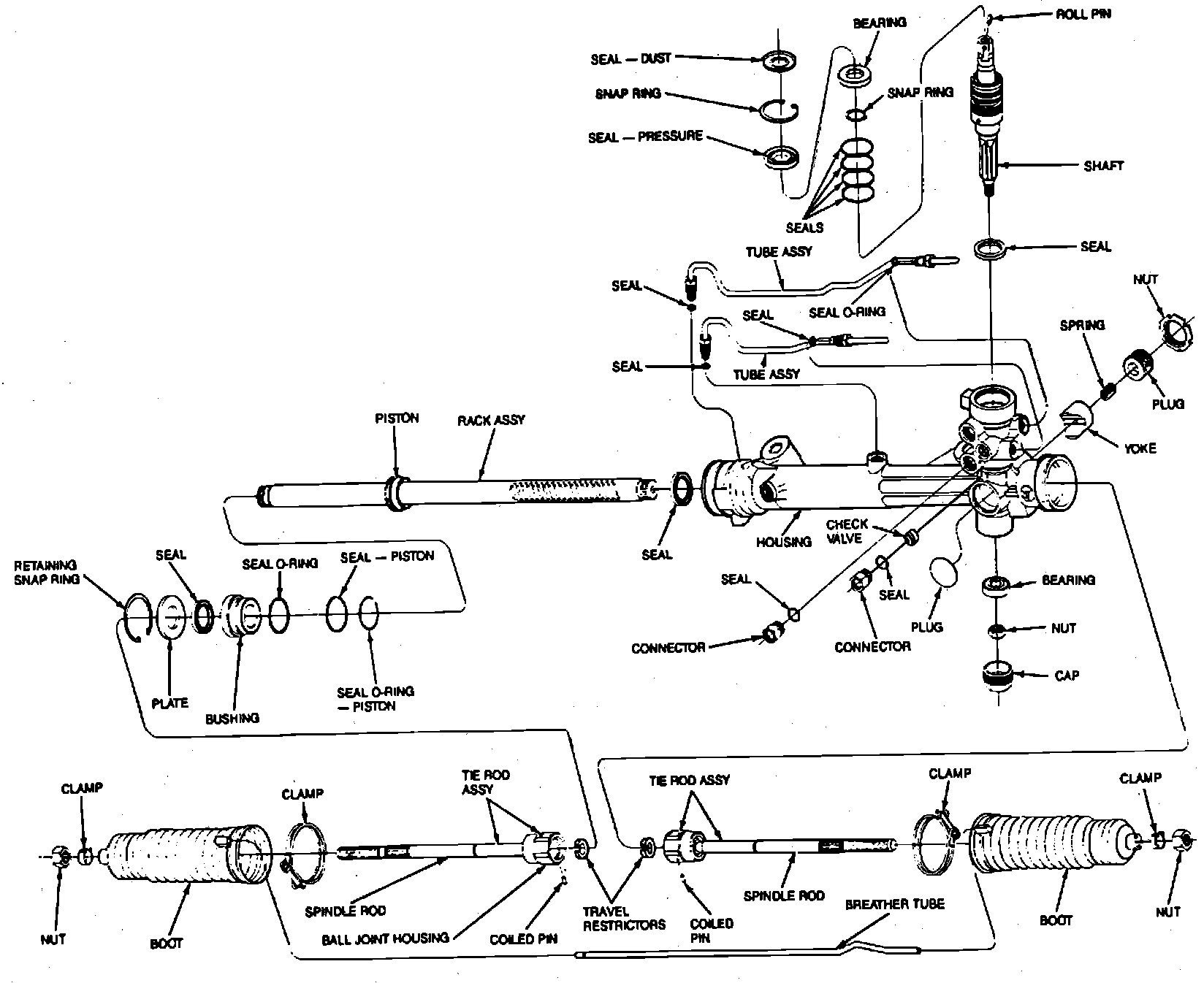 This power rack and pinion steering gear, Fig. 3, is a hydraulic-mechanical unit, using an integral piston and rack to provide power assisted steering control. Internal valve controls pump flow and pressure as required during operation. The unit consists of a rotary hydraulic control valve connected to the input shaft and a boost cylinder integral with the rack.