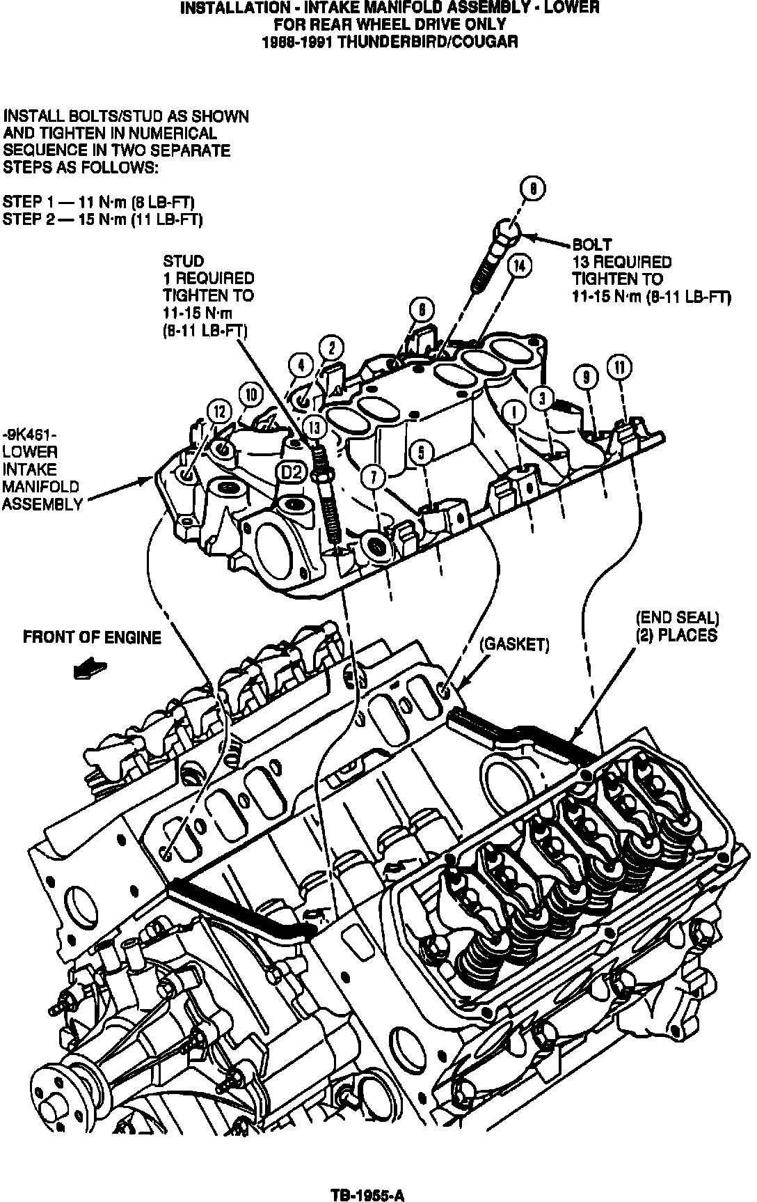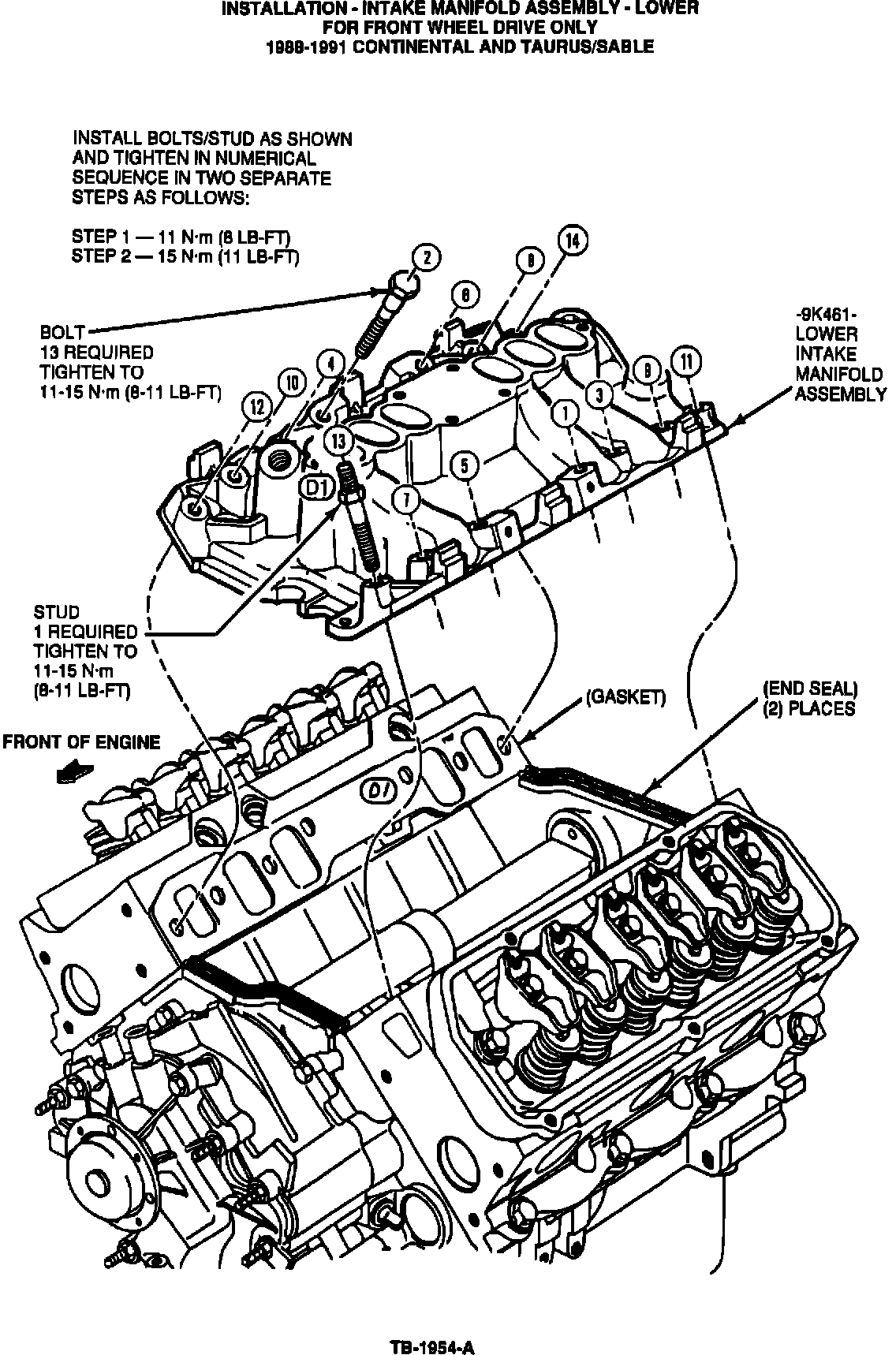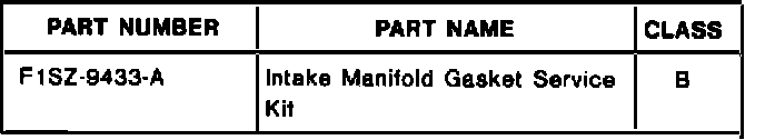 ISSUE: A new graphite intake manifold gasket service kit (F1SZ-9433-A) is now available for service use. The torque specifications and tightening sequence in the 1988-91 subject vehicle Shop Manuals, Section 21-15, have also been changed to accommodate the new graphite intake gasket.