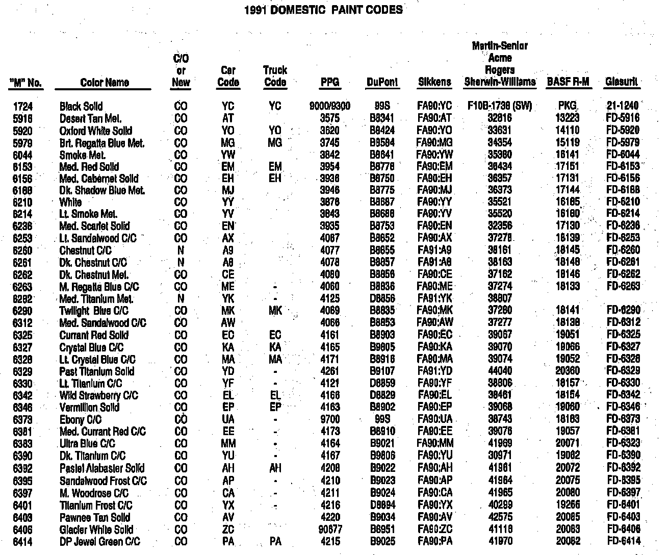 1991 DOMESTIC PAINT CODES