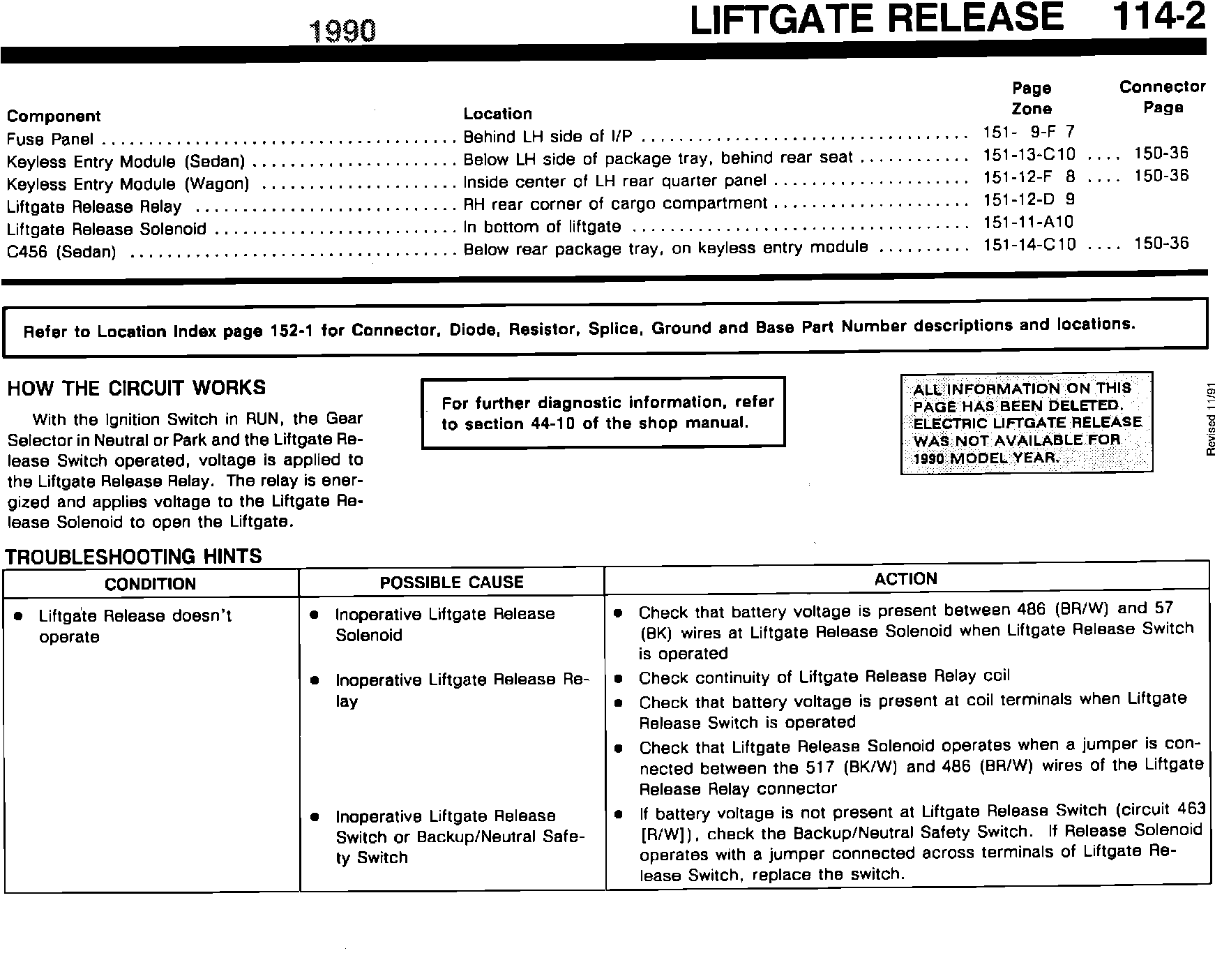 ISSUE: References to the Remote Liftgate Release for 1990 and 1991 Taurus/Sable vehicles must be deleted, as this component was not available as an option in these vehicles. Pages 1-2, 114-1 and 114-2 of the 1990 Taurus/Sable EVTM and Page 1-2 of the 1991 Taurus/Sable EVTM are affected.