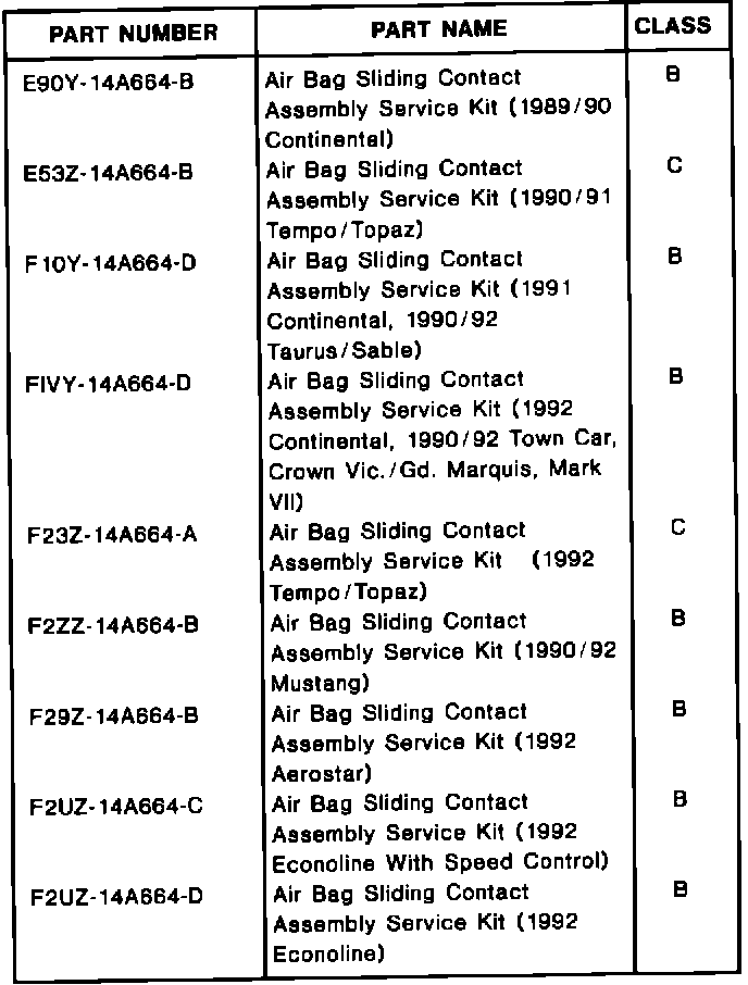 ACTION: Install an air bag sliding contact assembly (clockspring) service kit. Refer to the instruction sheets included in the kits for installation details. Refer to the parts block for correct parts usage.