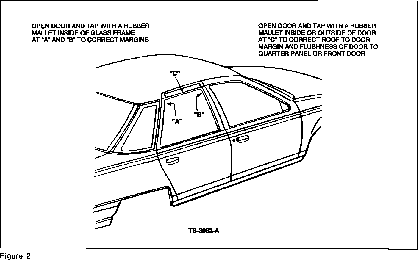 b. Lightly tap the door top frame with a rubber mallet in the direction the frame has to move, inboard/outboard, Figure 2.