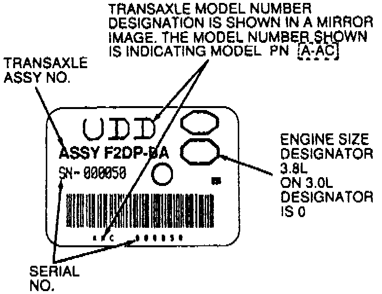 The Identification Tags, located on top of the converter housing, includes transaxle assembly number, serial number, and build date.