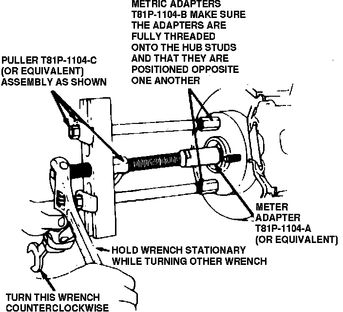 d. Separate hub assembly from outer CV joint using hub remover T81P-1104-C, adapters T83P-1104-BH, T86P-1104-A1 and T81P-1104-A or equivalent, Fig. 3. Never use a hammer to separate hub assembly from outer CV joint as damage to the CV joint threads and internal components may result.