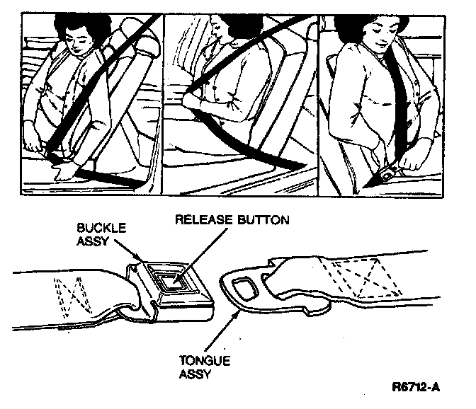Pull the lap-shoulder safety belt from the retractor so that the shoulder portion of the belt crosses the shoulder and chest. Insert the belt tongue into the proper buckle until a snap is heard and a latch is felt.
