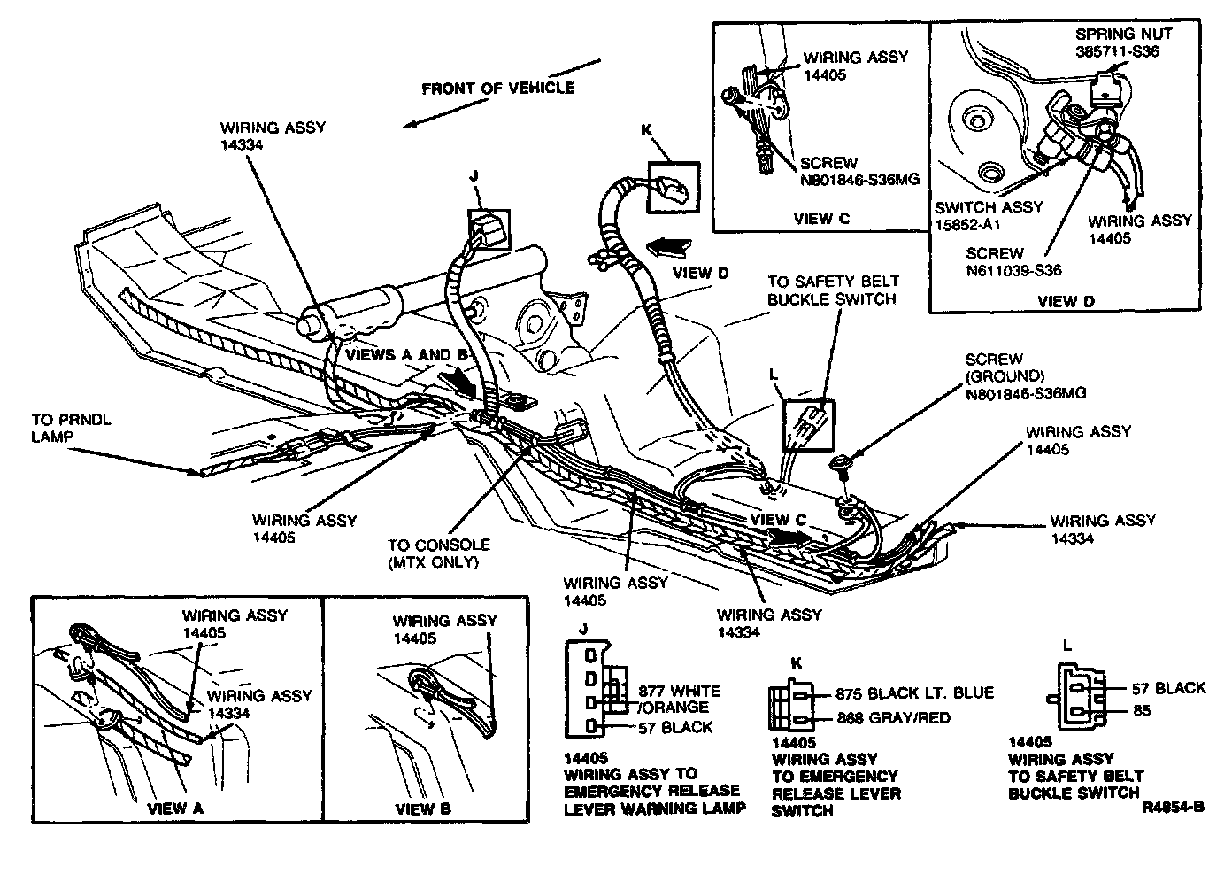All three connectors are part of the 14405 wiring assembly and are located in the floor console area. The circuits are connected to the 14401 wiring assembly, in the LH cowl area by a 12-pin connector.