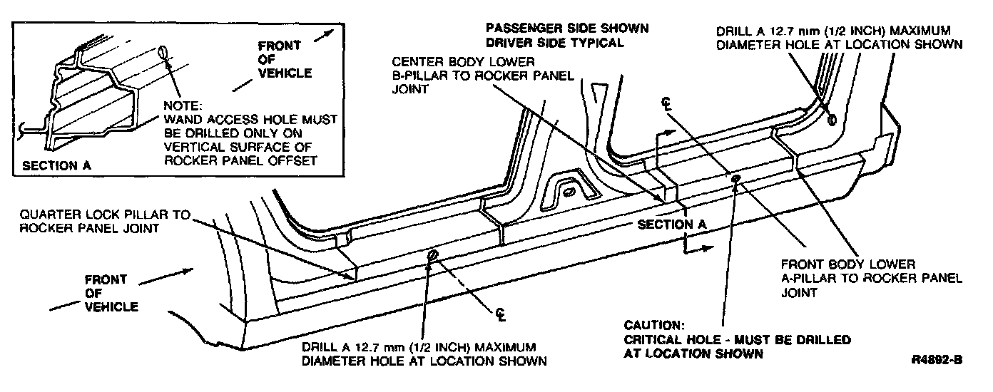 To ensure that no damage occurs to the front seat shoulder strap guide, refer to the illustration for recommended locations for drilling the required rustproofing wand access holes. Use one of the following drill bits: R-500 12.7 mm (1/2 inch) or equivalent, Rotor Broach with locating pin, RBA-330 (Arbor) or a Unibit VII 12.7 mm (1/2 inch) or equivalent size drill bit.