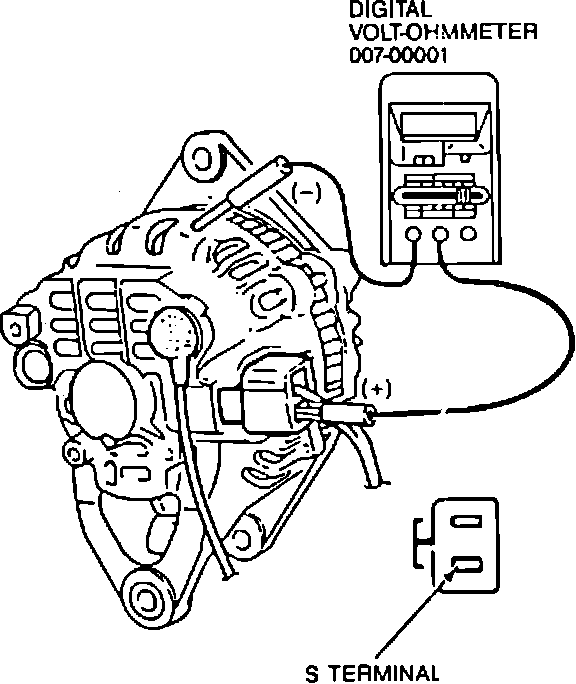 2. Disconnect ``S'' terminal connector from rear of alternator, then connect voltmeter positive lead to ``S'' terminal connector harness and negative lead to alternator case, Fig. 3. Read and record voltage.