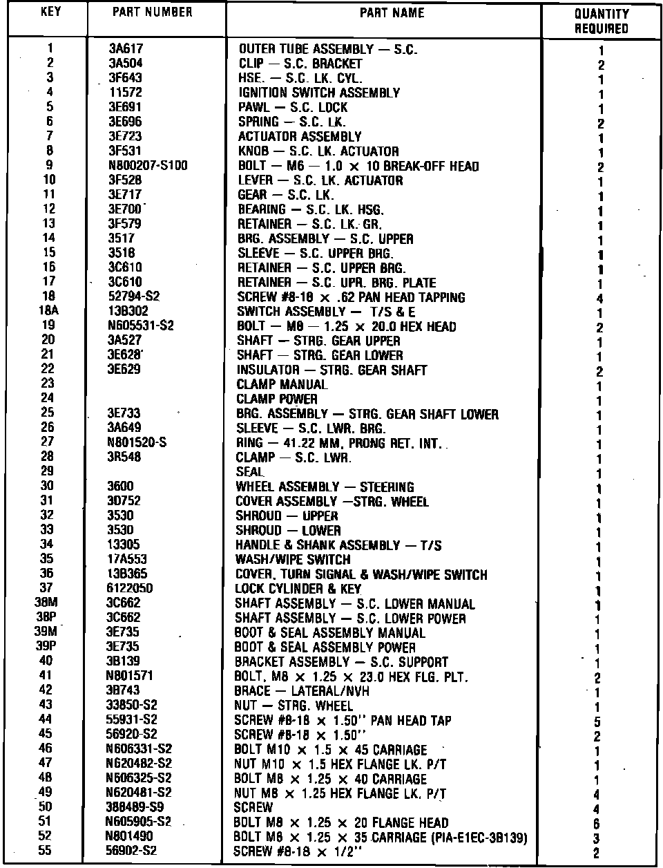 When servicing collapsible steering columns, care should be exercised since they are extremely susceptible to damage. Dropping of or leaning on column or striking sharp blows on end of steering shaft or shift levers could loosen or shear plastic fasteners which maintain column rigidity. It is important that only the specified screws, bolts and nuts be used during the mandatory reassembly sequence and torqued to specifications to insure proper breakaway action of column under impact. Avoid using excessively long bolts as they may prevent a portion of the steering column from collapsing under impact. When removing or installing, steering wheel, ignition switch or lock, turn signal switch, adjusting transmission linkage, or installing and adjusting neutral-start or back-up light switch, refer to appropriate car chapter. If a shift tube shows a sheared plastic injection, a new shift tube must be installed. If a steering shaft shows a sheared plastic, or if the steering column has been collapsed a complete new column must be installed. On some models, the attaching brackets will shear under impact and must also be replaced.