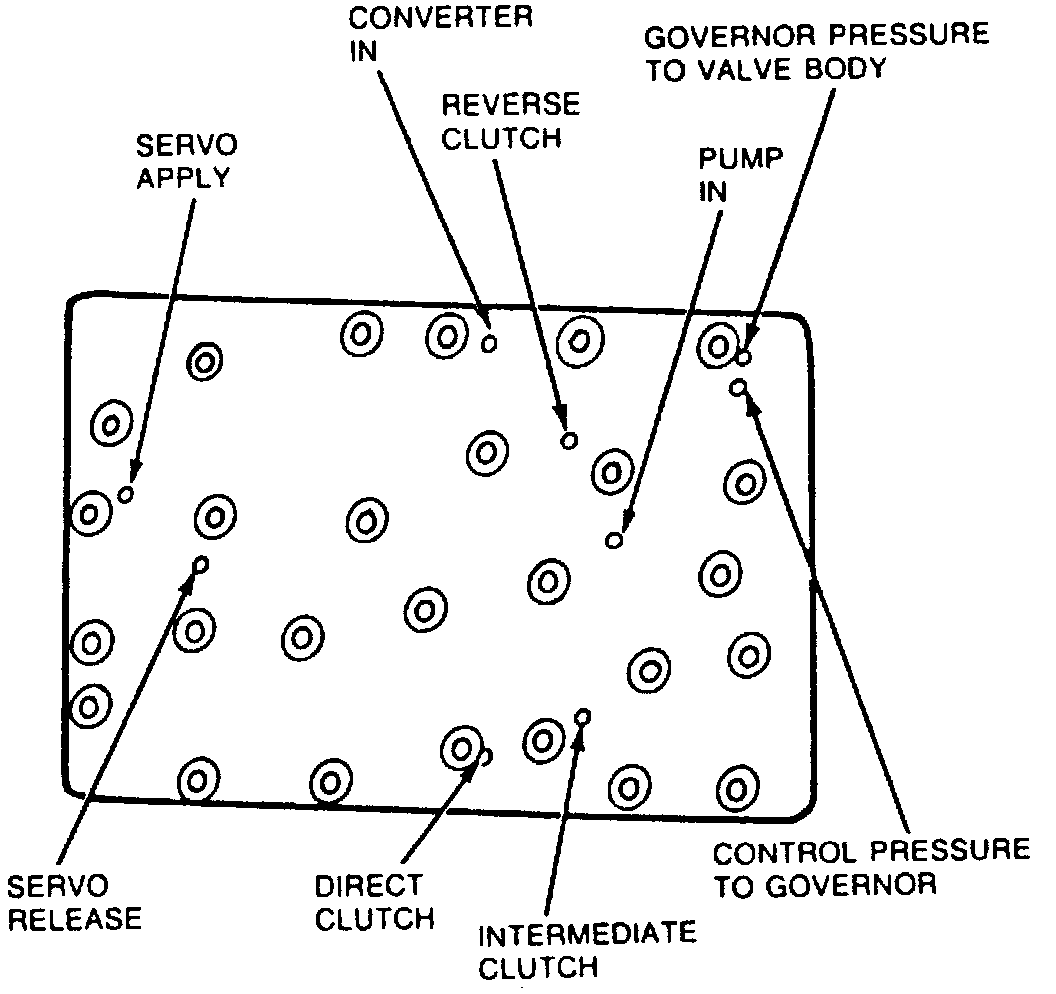 AIR PRESSURE CHECKSNOTE: Inoperative clutches or bands can cause a No Drive condition when fluid pressure is correct. The malfunctioning components can be located by a series of checks using air pressure instead of fluid pressure. To make these checks, proceed as follows:
