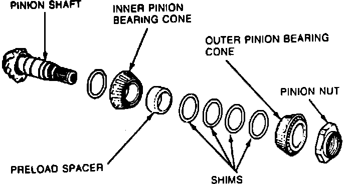43. Remove pinion nut using suitable tools. Tap pinion using a suitable hammer to remove it from housing. Save bearing preload spacer and preload shim. Remove outer pinion bearing cone.