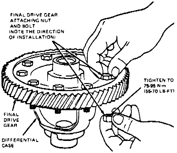 2. If final drive gear was replaced, press new gear onto differential case, install gear attaching nuts, then torque nuts to 55-70 ft lbs.