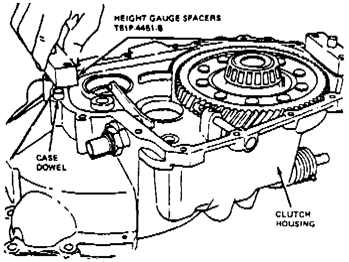c. With differential installed position in clutch housing, install height gauge spacers T81P-4451-B2 and T83P-4451-AH2 or equivalents, onto clutch housing dowels.