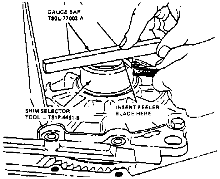 f. Position gauge bar tool T8OL-77003 or equivalent, across shim selector tool.