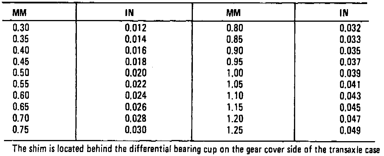 Differential Selective Shim Chart: