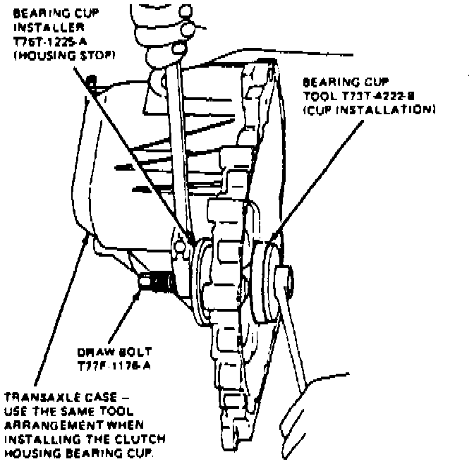 h. Install shim into transaxle case using tool Nos. T77F-1176A, T75T-1225A and T73T-4222B or equivalents. Ensure cups seat fully into cover.