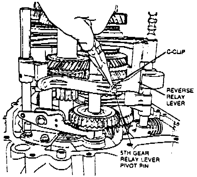 14. Install 5th gear relay lever onto reverse idler shaft, then the shaft and fork interlock sleeve and reverse gear actuating arm slot. Install retaining C-clip.
